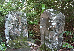 天竜の森に向かって走ると、左手に「塩の道」の立派なモニュメント(標識)がたつている。すぐ奥の草むらに二体の石仏が立っていた。「前不動」と書かれた説明板もある。